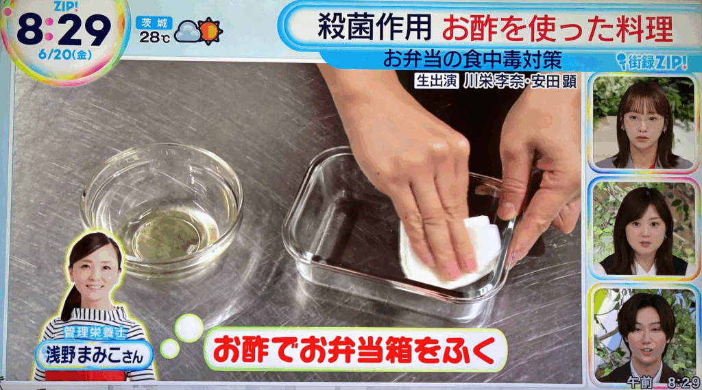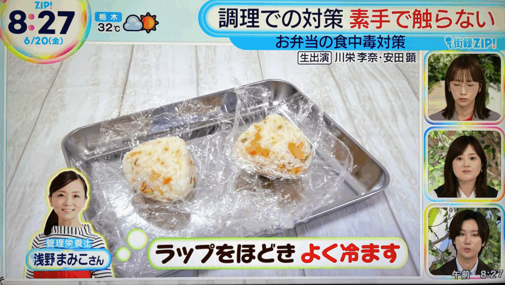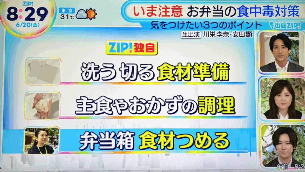 2025.6.20 日本テレビZIPにてお弁当の食中毒対策について解説しました 日本テレビZIP!にて浅野まみこが「お弁当の食中毒対策」について解説しました。 食中毒予防の三原則は「つけない」「増やさない」「やっつける」です。 すぐ食べる料理と気をつけておくべきポイントが変わりますが、コツを知っていると安心してお弁当を持っていくことができるはずです。 #食と健康 #食中毒対策 前の記事へ 次の記事へ