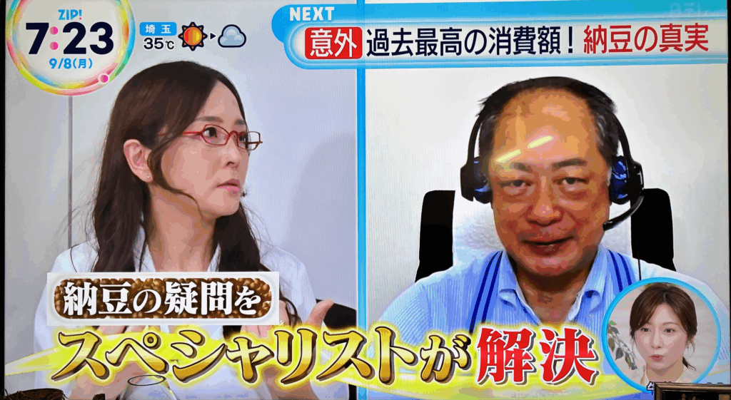 2025.9.8 日本テレビZIP! 「納豆の真実」 日本テレビZIP! に 浅野まみこが出演いたしました。 「意外 過去最高の消費額!納豆の真実」というテーマで、納豆の栄養素、意外な食べ方の盲点を解説しています。 納豆については、浅野がインスタグラムで健康コスパも解説しています。 ぜひこちらもご覧ください。 https://www.instagram.com/reel/DQoYWHyE_zE #食と健康 #熱中症予防 前の記事へ 次の記事へ