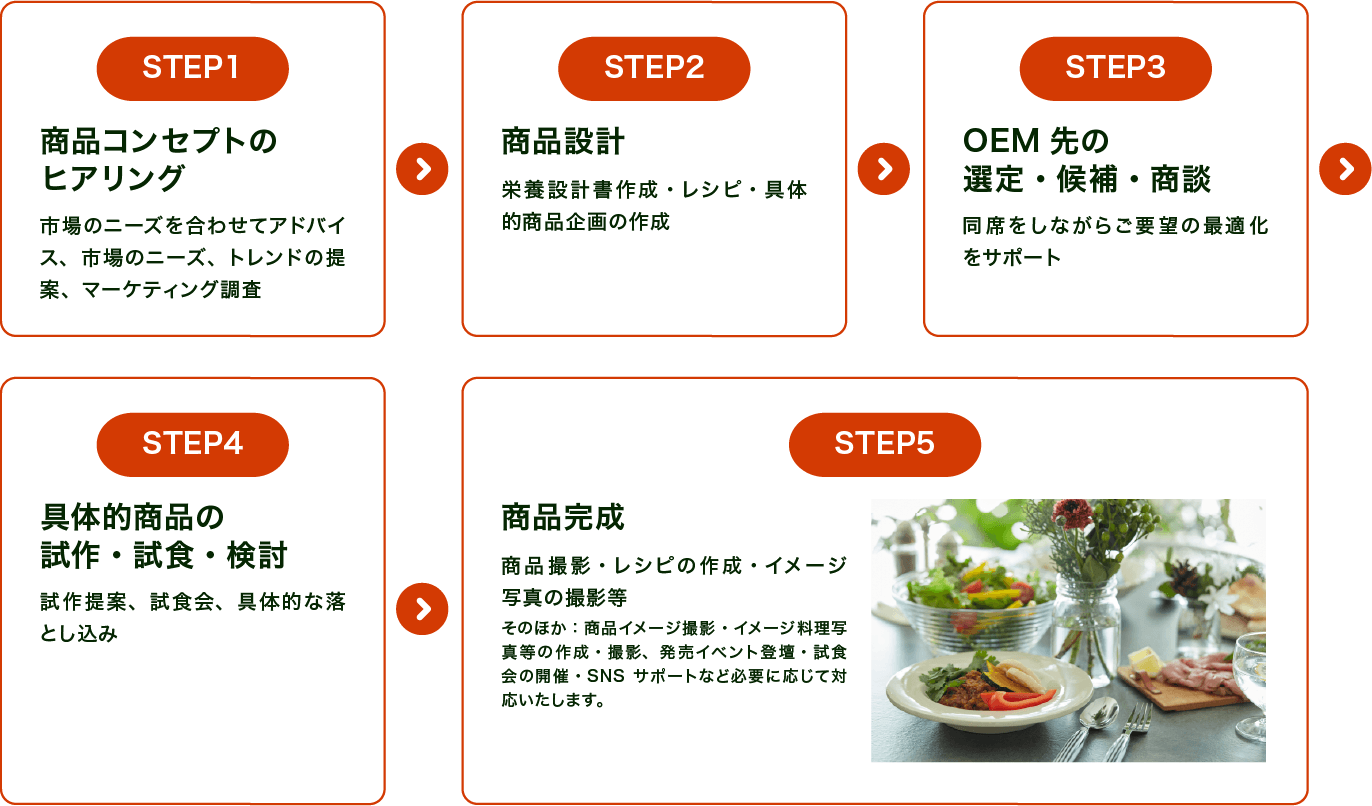 管理栄養士・料理家の知見を活かし、目的に合わせたブランディング、商品の企画、開発・販売戦略を総合的に支援します。定期的な戦略会議を実施、コンセプト立案からレシピ開発、栄養設計に加え、適切なOEM先の選定・交渉をサポートします。販売促進に向けたイベントやリリースなど戦略的にサポートします。